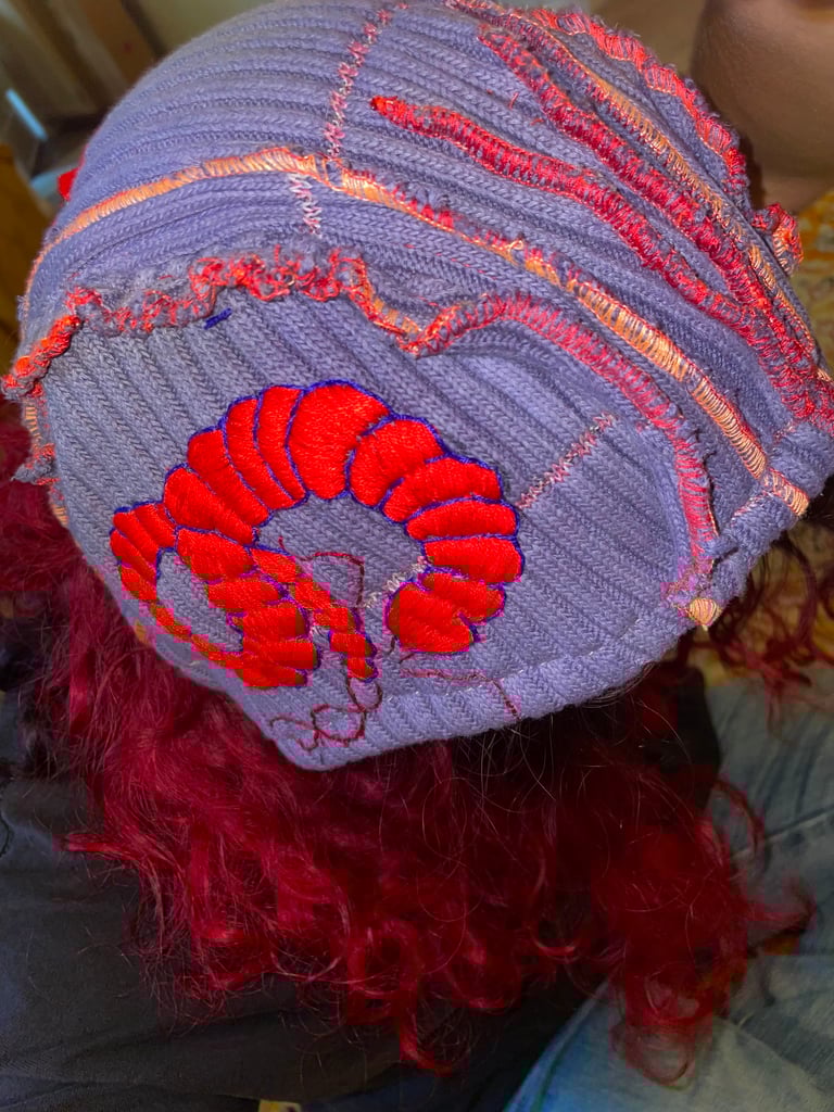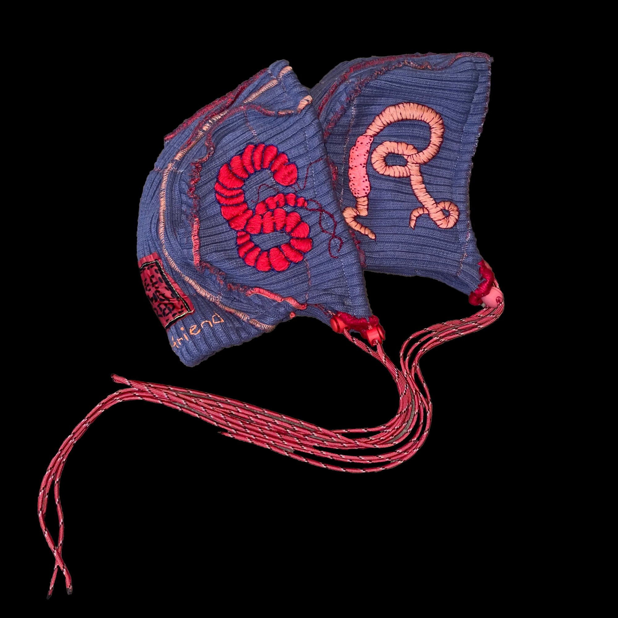 100% handmade seeing red thick rib bonnets with schoolfriend hand-embroidered parasite initials & evil wandering creatures. "S" centipede features swamp spirit on the other side and "R" worm has little nymph dollie on other side.