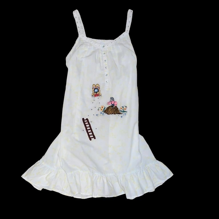 highly detailed hand-embroidered story cloth with real mirror detail on pure cotton dress with milky pearlescent buttons
